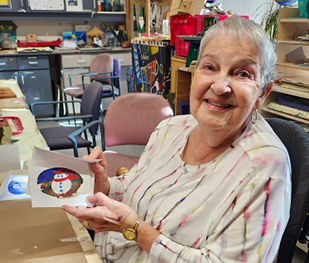MWO Gail Fugere (Ret'd), MMM, SSM, CD, a Veteran resident at Perley Health, making Christmas cards to send to Canadian Armed Forces (CAF) members who are deployed overseas.
